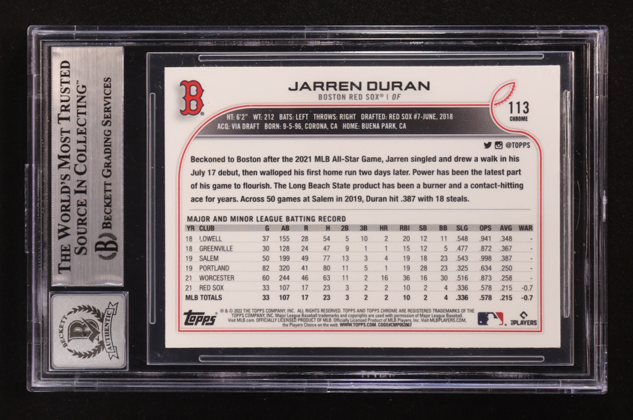 Jarren Duran Signed 2022 Topps Chrome #113 RC (BGS | Autograph Graded BGS 10)