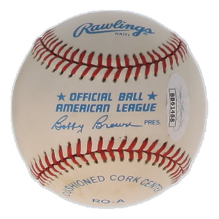 Rawlings Official American League baseball. Hand-signed by Mickey Mantle (D. 1995, New York Yankees, HOF). Please note, ball has been naturally stained and toned.