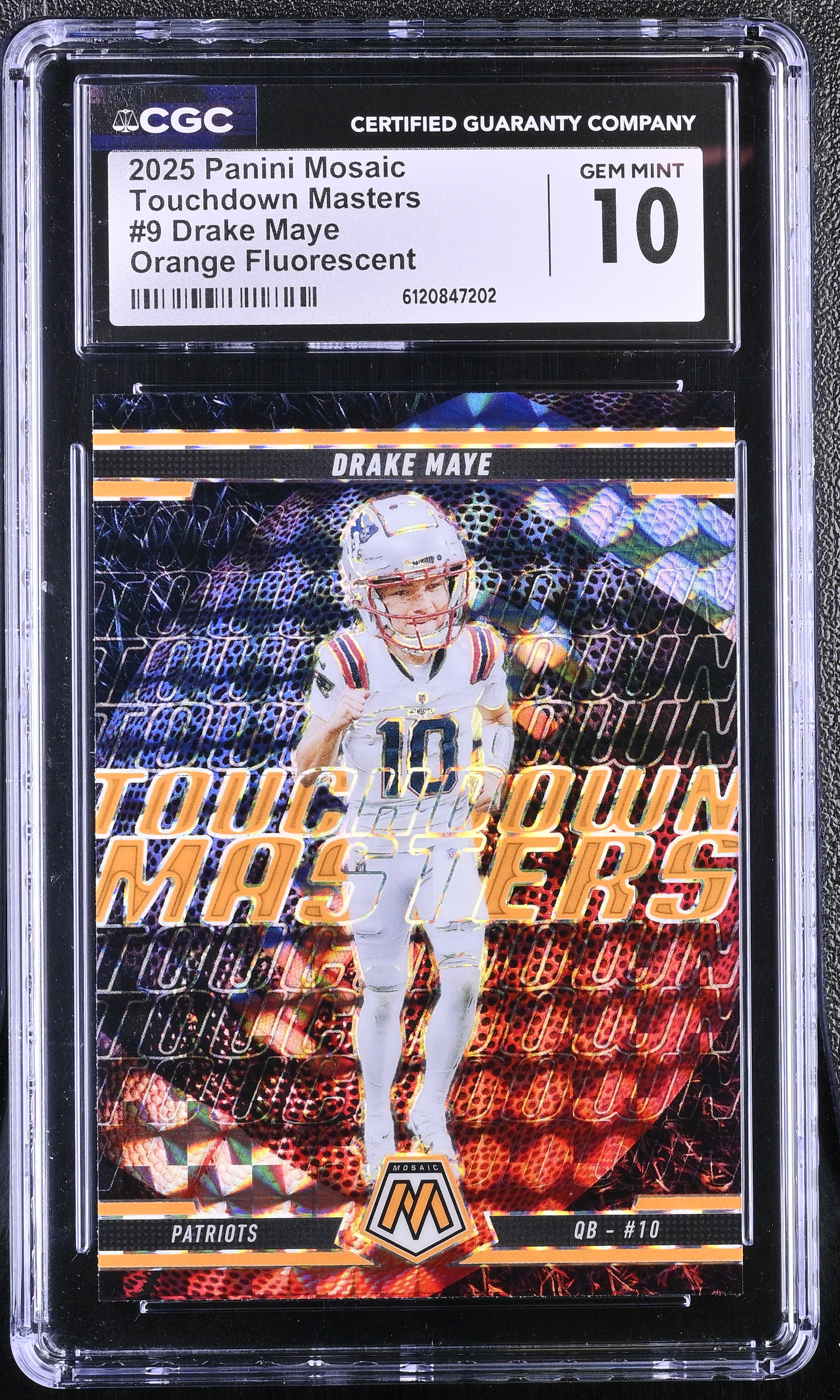 Drake Maye 2025 Panini Mosaic Touchdown Masters Mosaic Orange Fluorescent #9 (CGC 10)