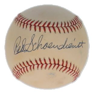 Rawlings Official National League baseball. Hand-signed by Red Schoendienst (D. 2018, St. Louis Cardinals, HOF). Please note, ball has been naturally stained and toned.