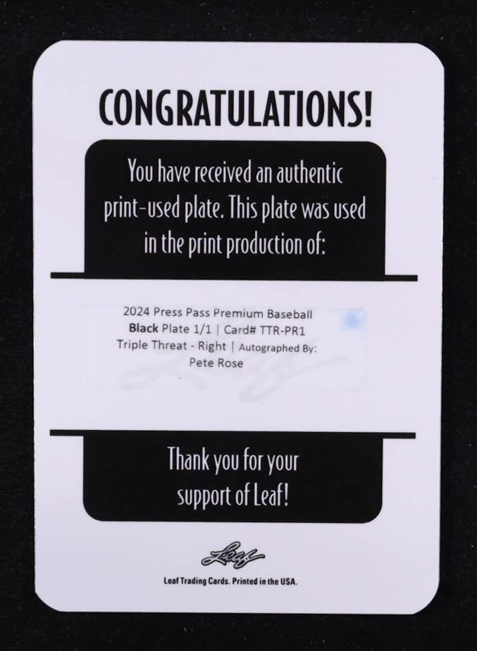 Pete Rose 2024 Press Pass Premium Triple Threat Right Autographs Printing Plates Black #TTRPR1 #1/1