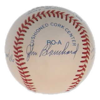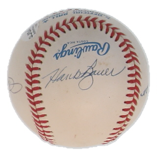 Rawlings Official American League baseball. Hand-signed and inscribed by (4) with Tom Tresh, Moose Skowron, Hank Bauer and John Blanchard. Please note, ball has been naturally stained and toned.