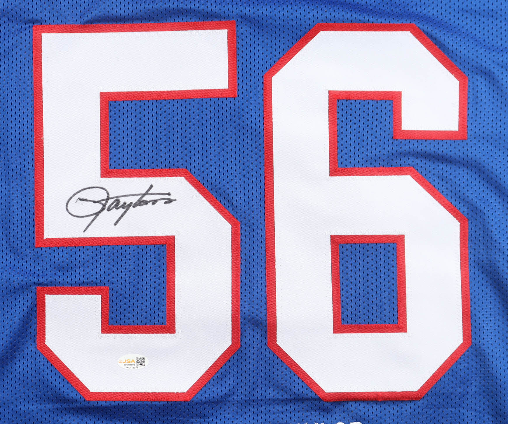Custom jersey with everything sewn on, size XL. Hand-signed by Lawrence Taylor (HOF). Taylor's career highlights have been custom stitched onto the back of the jersey below the reverse numbers.