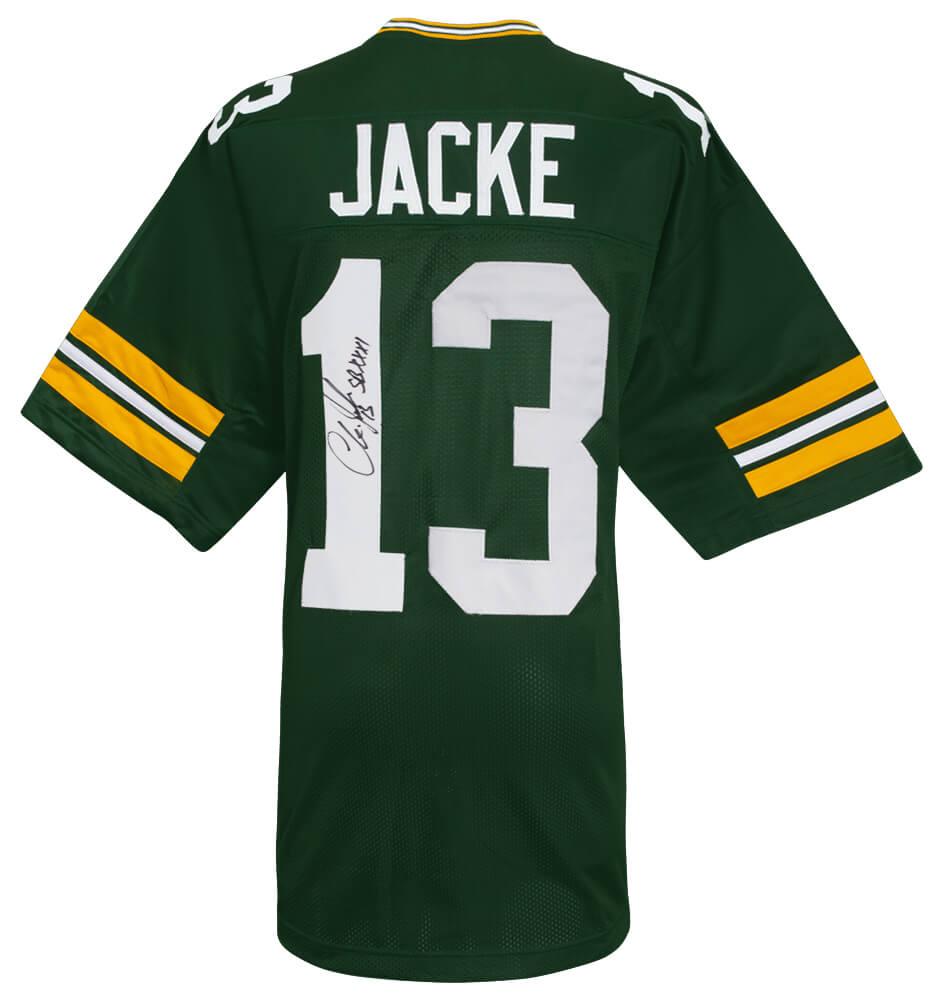 Custom jersey with everything sewn on, size XL. Hand-signed and inscribed by Chris Jacke.