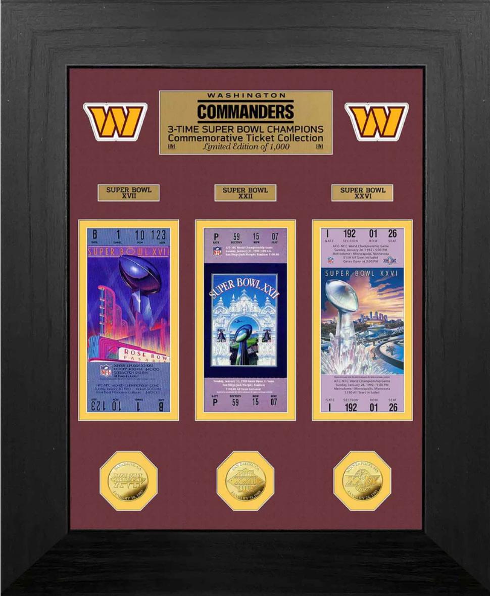 Commanders "3-Time Super Bowl Champions" Custom LE Framed Ticket Display with (2) Gold Plated Coins