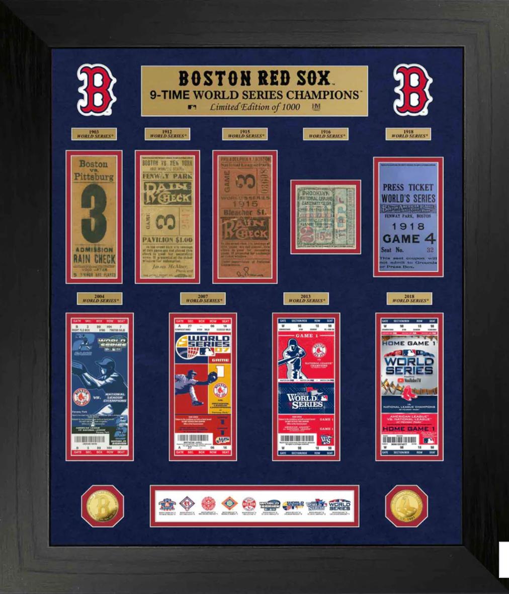 Custom frame measures 24" x 30" in size and features (9) commemorative World Series tickets for the Boston Red Sox. Included with the frame are (2) solid gold plated coins.