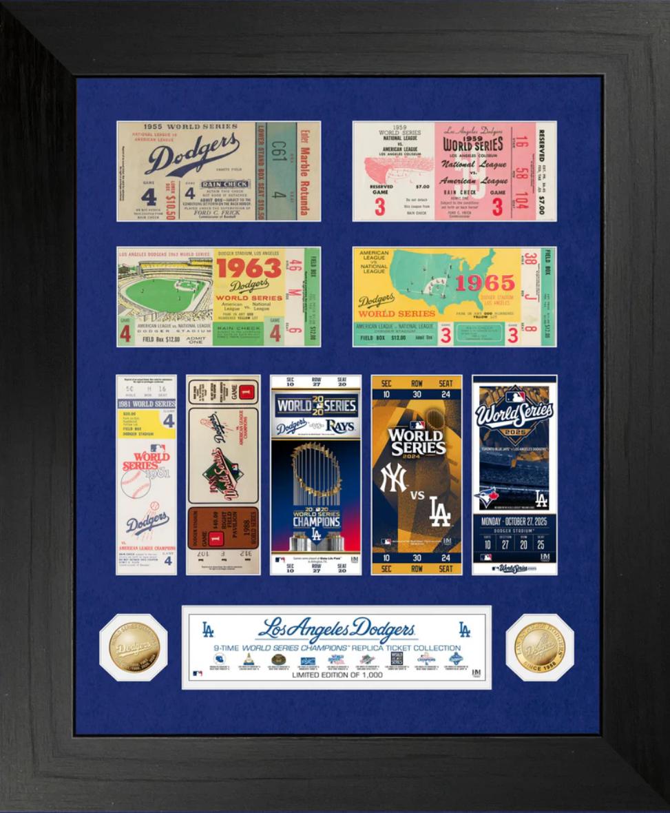 Custom frame measures 20" x 24" in size and features (9) commemorative World Series tickets for the Los Angeles Dodgers. Included with the frame are (2) solid gold plated coins.