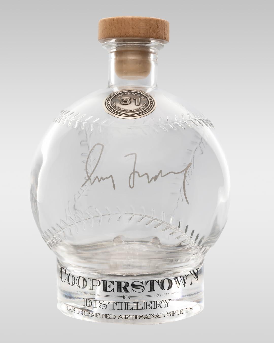 Custom Glass Cooperstown Canton Distillery 750ML Decanter commemorating Greg Maddux (Atlanta Braves, HOF). Please note, the signature is a facsimile and the glass features the Baseball Hall of Fame logo.