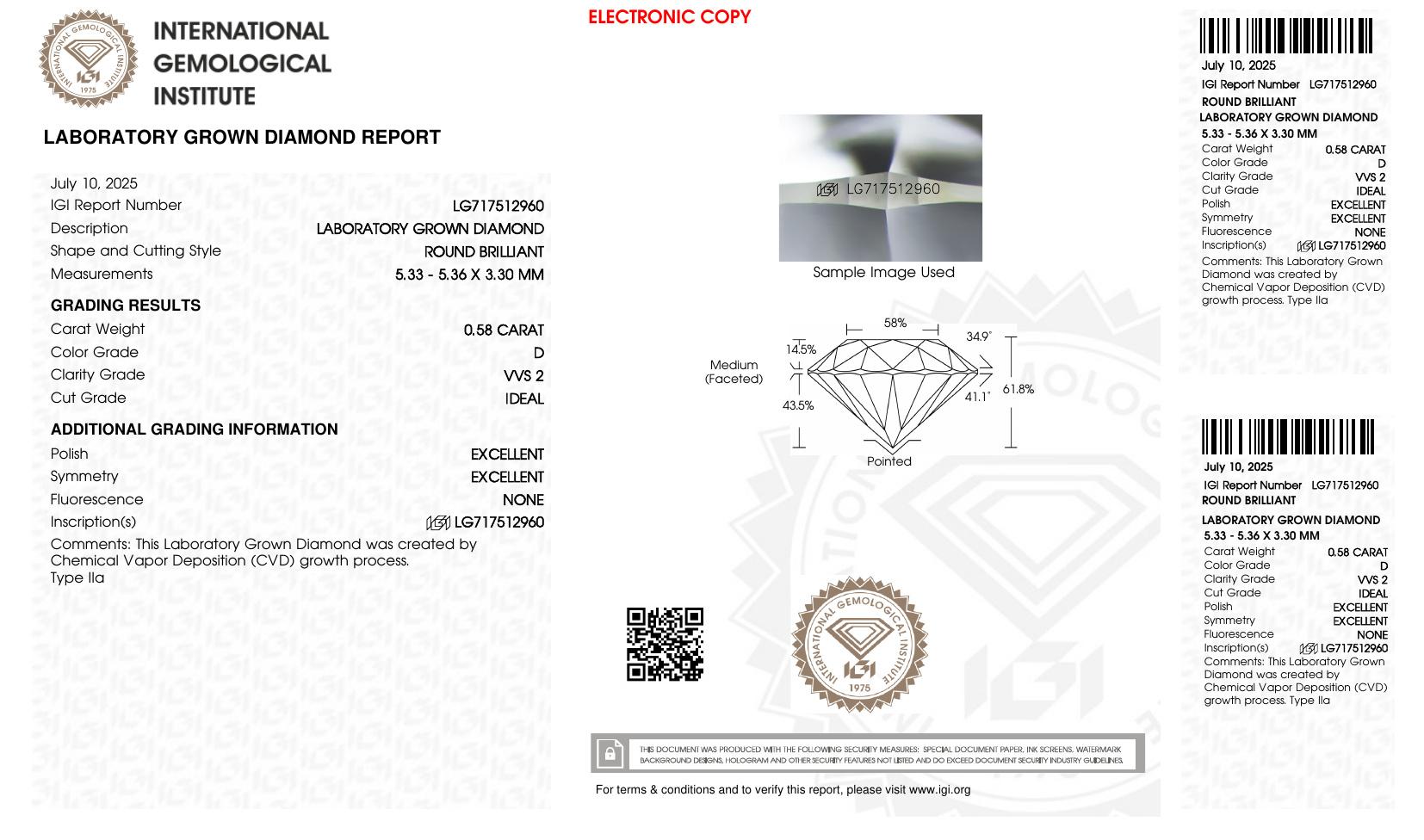 Two IGI laboratory grown diamond certificates