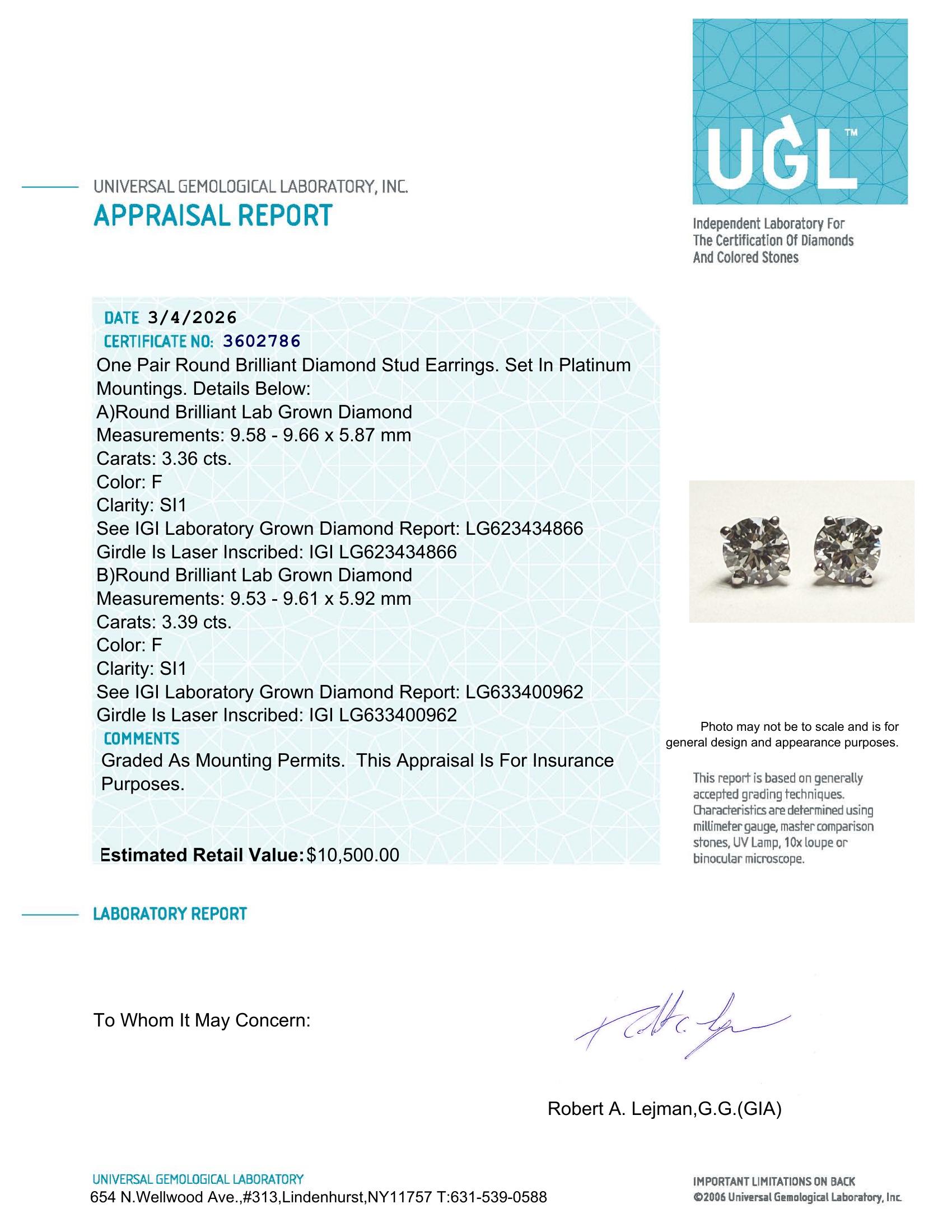 Platinum 6.75 Carats Lab Grown Diamond Stud Earrings F, SI1 | $10,500 Estimated Retail Value (UGL & IGI Certs) | Round Ideal Cut| Brand New