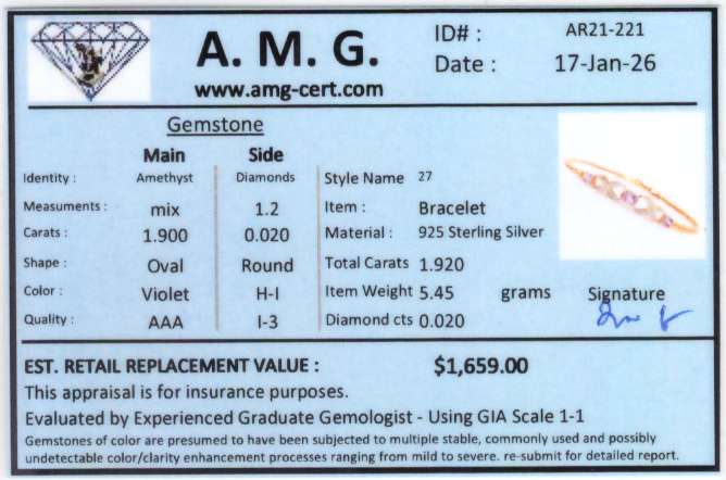 1.92 CTW Natural Amethyst & Diamonds 18K Gold Plated Designer Bracelet Size 7.75 Inches | Estimated Value $1,659 (AMG)