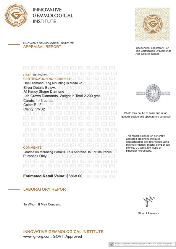 This piece includes paperwork from the Innovative Gemological Institute (IGI).