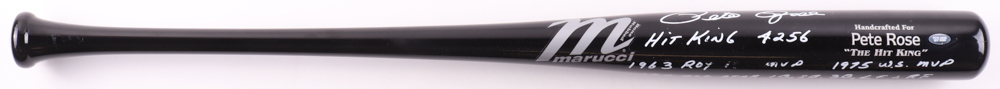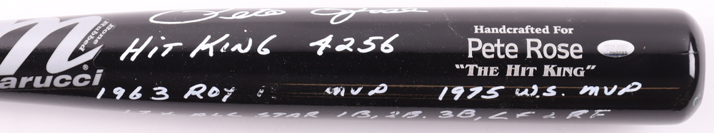 Marucci Pete Rose "The Hit King" baseball bat has been hand-signed and inscribed by Pete Rose (D. 2024, Cincinnati Reds). Please note some of the inscriptions are smudged, see photos for more details.