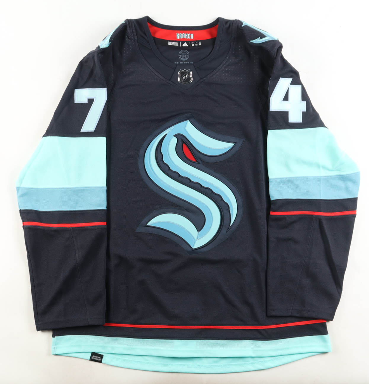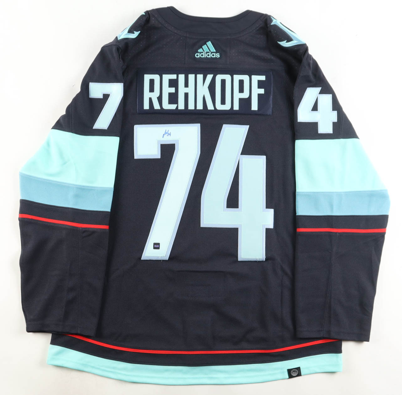 Adidas jersey. Everything is sewn on, size 52. Has been hand-signed by Carson Rehkopf (Seattle Kraken).