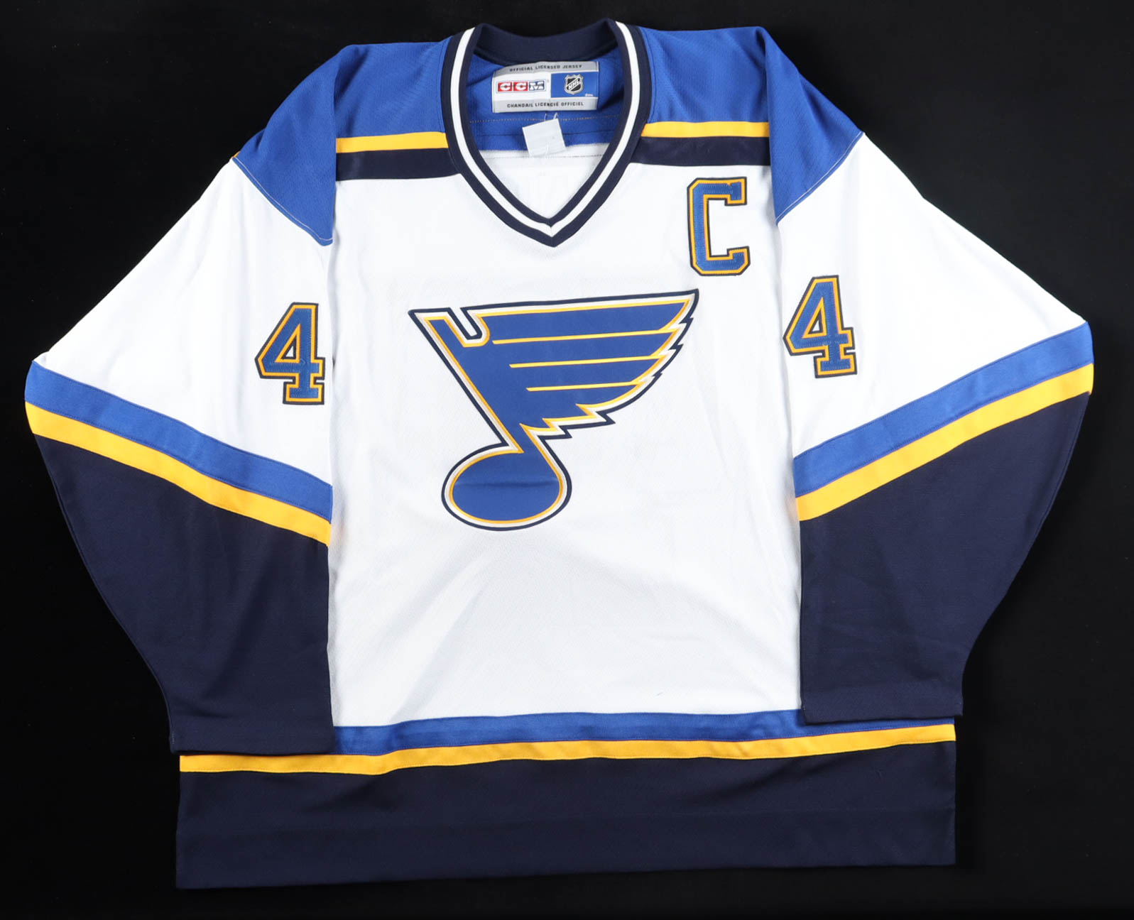 CCM jersey with everything sewn on, size XXL. Hand-signed and inscribed by Chris Pronger (St. Louis Blues, HOF).