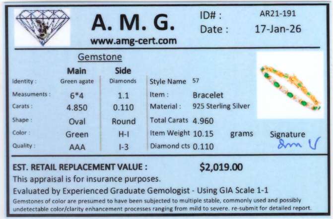 4.96 CTW Natural Green Agate & Diamond 18K Gold Plated Designer Bracelet Size 7.6 Inches | Estimated Value $2,019 (AMG)