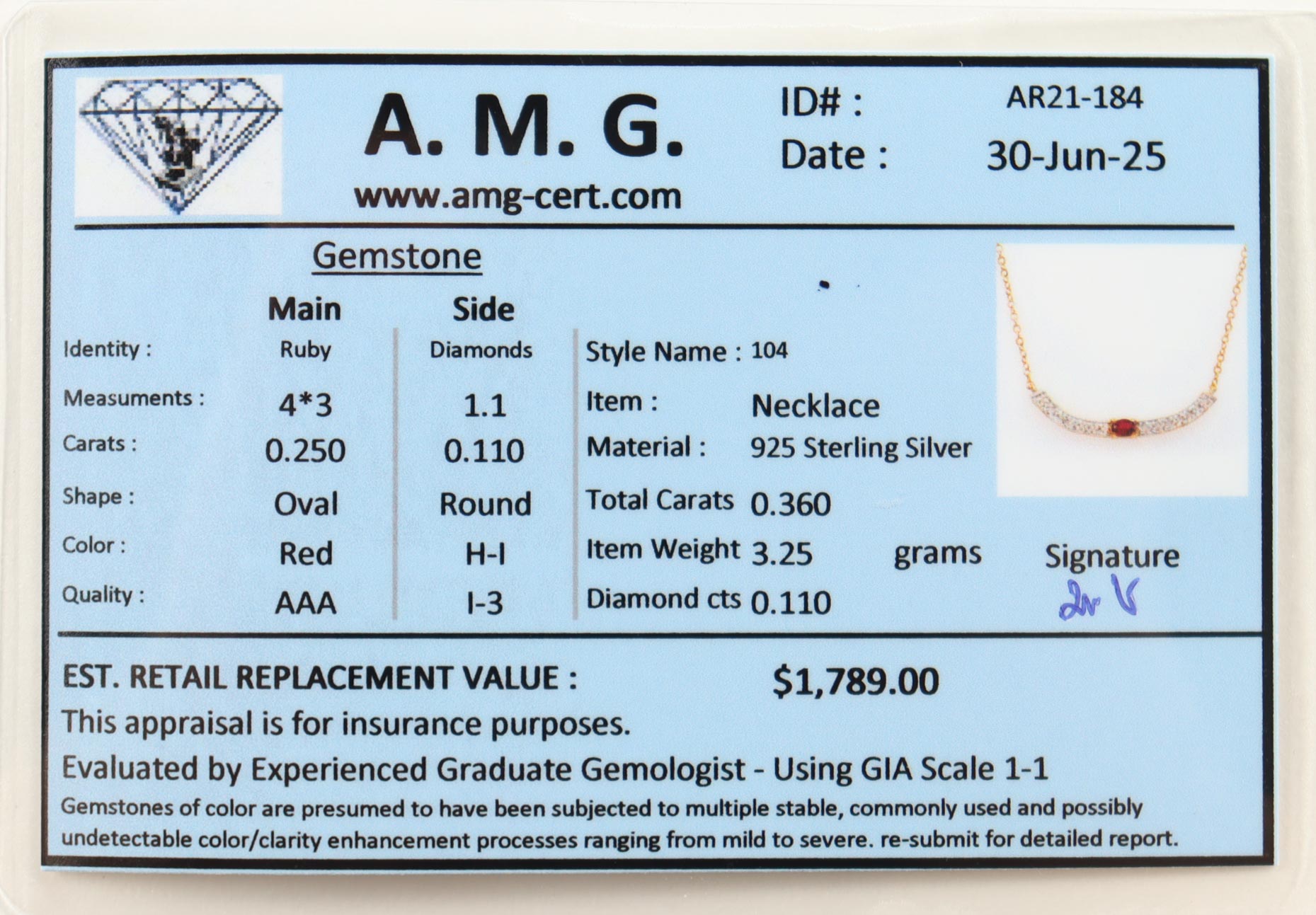 The item includes certification from AMG.