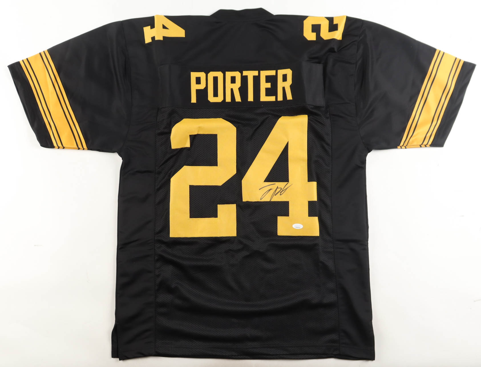 Custom jersey with everything sewn on, size XL. Hand-signed by Joey Porter Jr.. Please note, glue is visible through the reverse number.