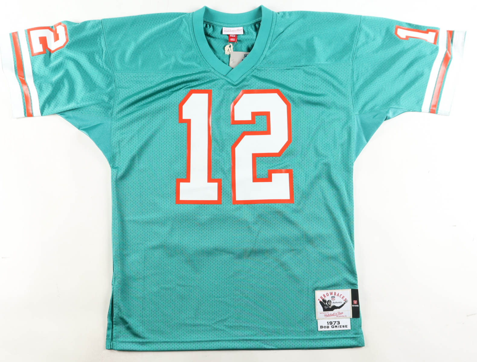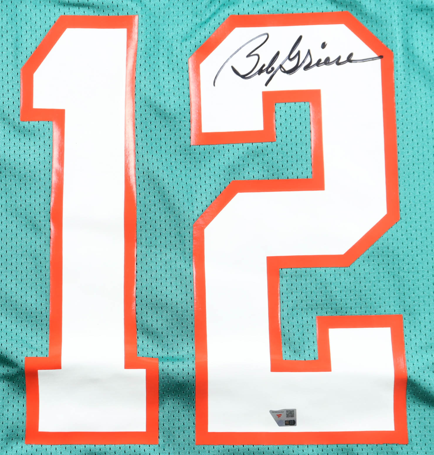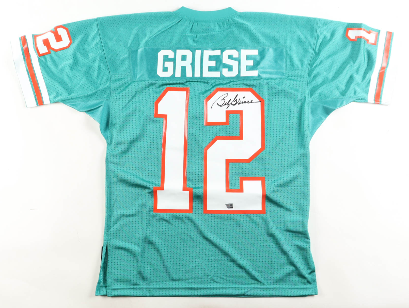 Custom jersey with everything pressed on, size 44 (L). Hand-signed by Bob Griese (Miami Dolphins, HOF).