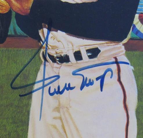 Custom frame measures 26” x 31” in size and features a photo that has been hand-signed by Mickey Mantle (D. 1995, New York Yankees, HOF), Willie Mays (D. 2024, San Francisco Giants, HOF) and Duke Snider (D. 2011, Los Angeles Dodgers, HOF).