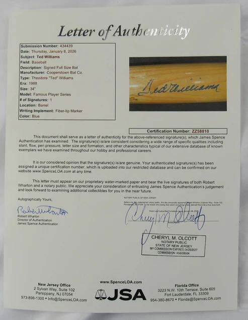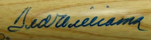 Rawlings baseball bat has been hand-signed by Ted Williams (D. 2002, Boston Red Sox, HOF).
