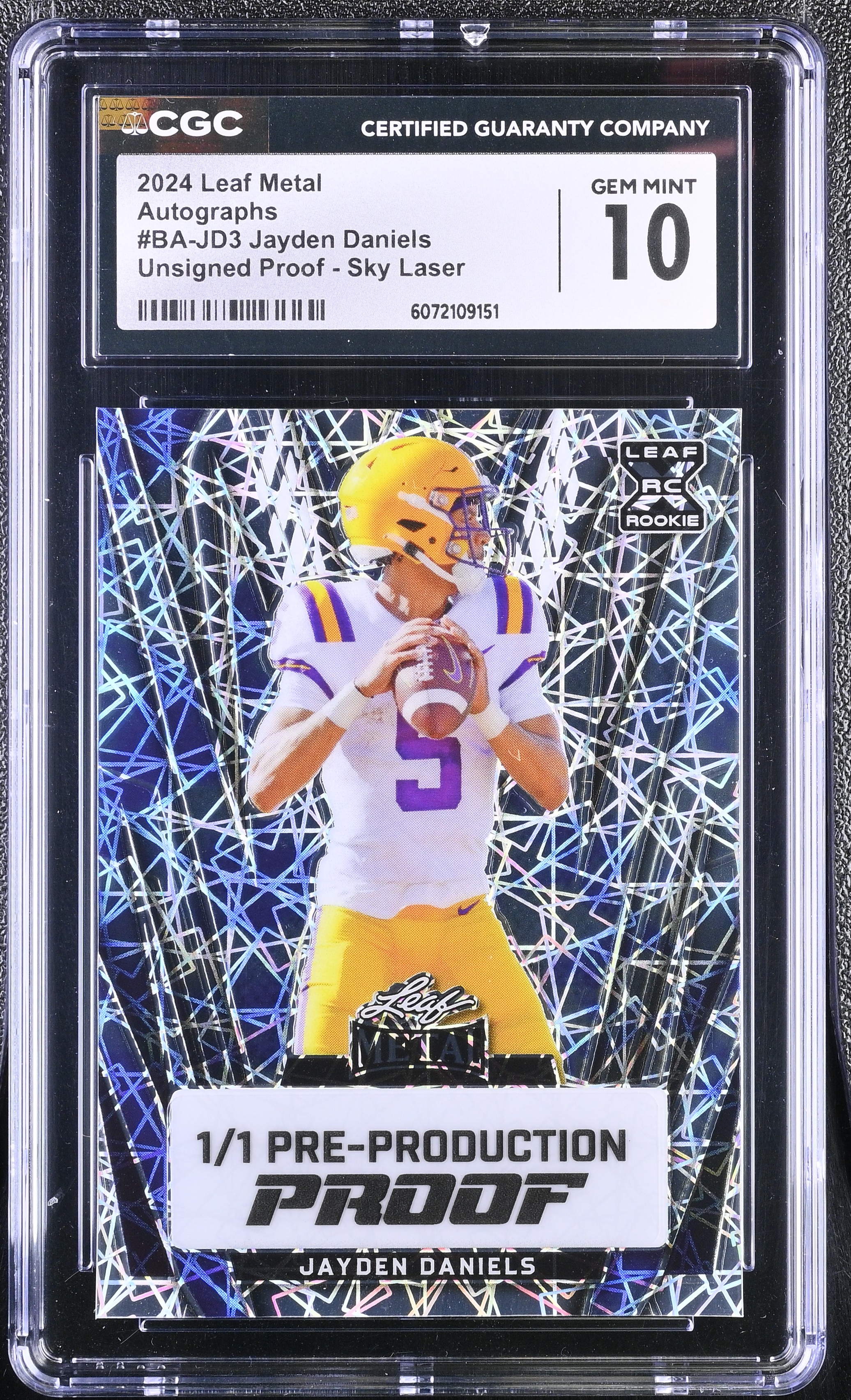 Jayden Daniels 2024 Leaf Metal Autographs Pre-Production Proof Unsigned Proof - Sky Laser #BA-JD3 RC #1/1 (CGC 10)