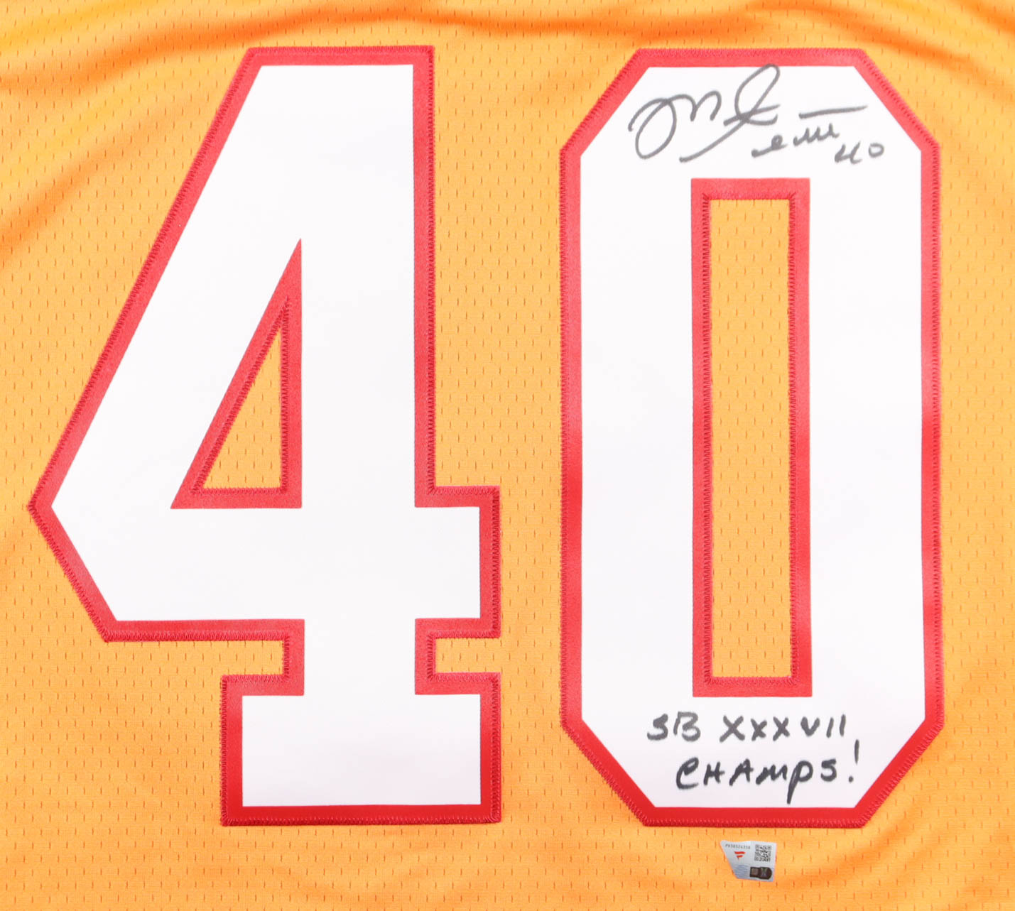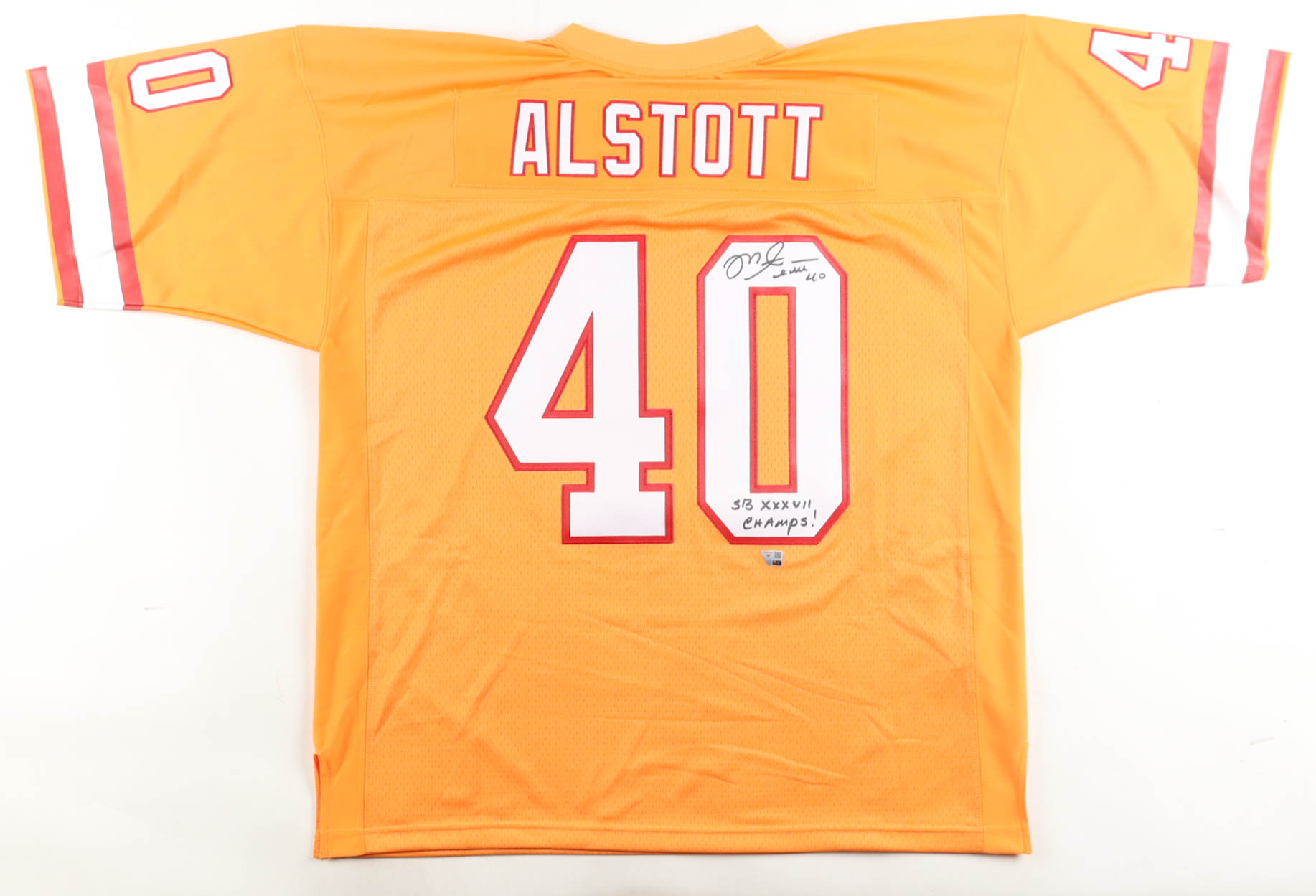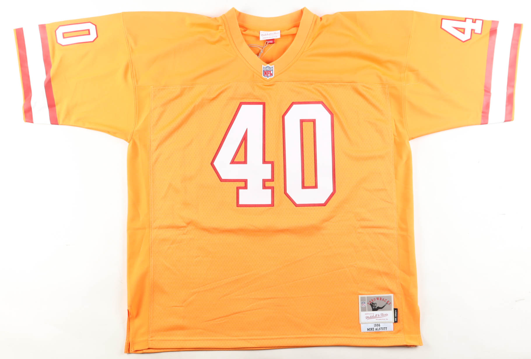 Mitchell & Ness jersey with everything sewn on, size 52 (2XL). Hand-signed and inscribed by Mike Alstott (Tampa Bay Buccaneers).