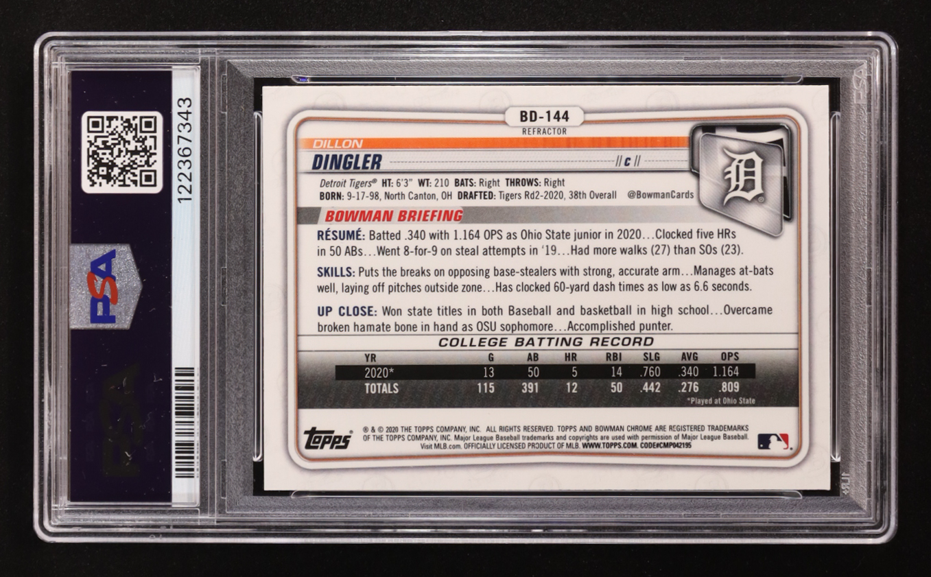 Dillon Dingler 2020 Bowman Draft Chrome Refractor #BD-144 RC (PSA 9)