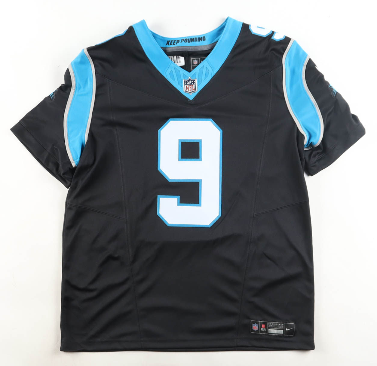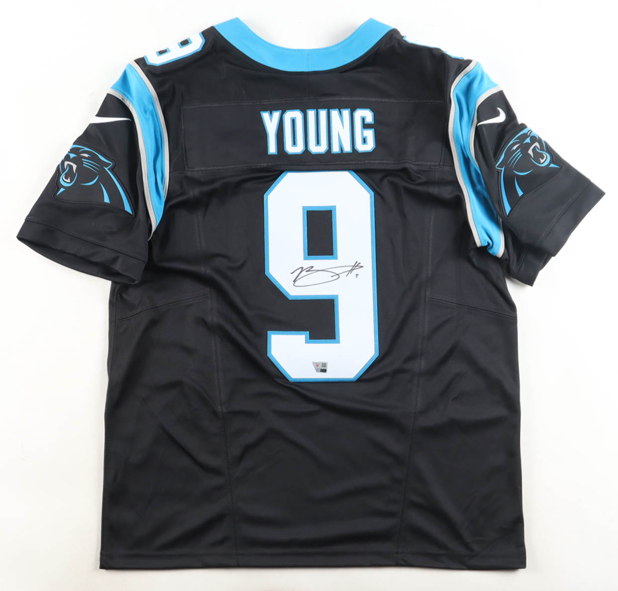 Nike jersey with everything sewn on, size L. Hand-signed by Bryce Young (Carolina Panthers).