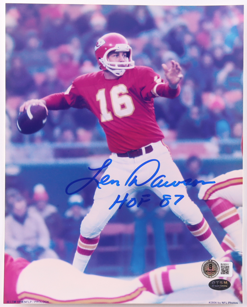 Photo measures 8" x 10" in size. Hand-signed and inscribed by Len Dawson (D. 2022, Kansas City Chiefs, HOF).