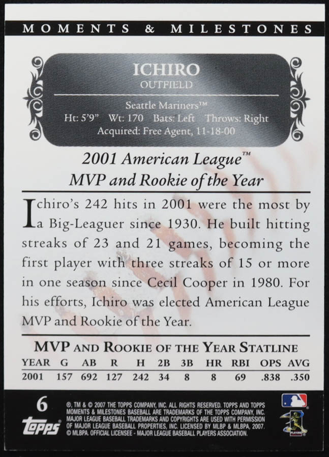 Ichiro Suzuki 2007 Topps Moments and Milestones Hit 67 #6-67 #058/150