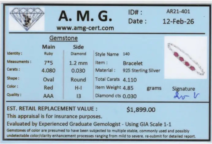 4.11 CTW Natural Ruby & Diamond Rhodium Plated Designer Bracelet Size 7.6 Inches | Estimated Value $1,899 (AMG)