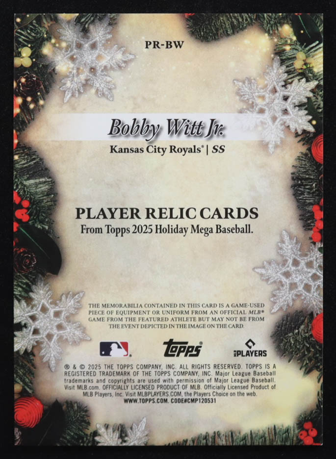 Bobby Witt Jr. 2025 Topps Holiday Player Relics Metallic Purple #PRBW #064/199