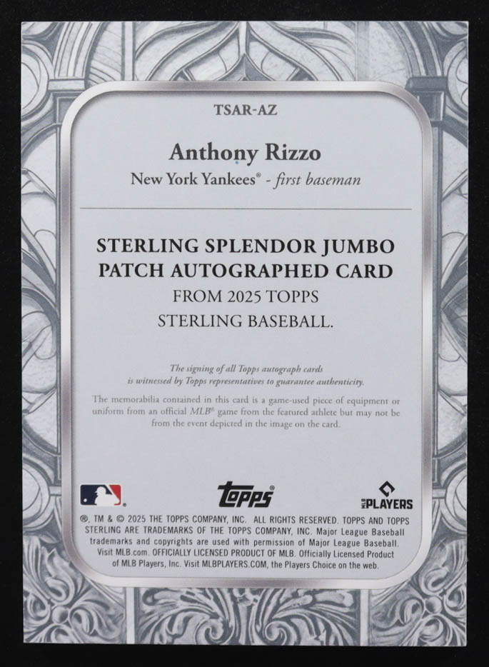 Anthony Rizzo 2025 Topps Sterling Sterling Splendor Jumbo Patch Autographs #TSARAZ #2/5