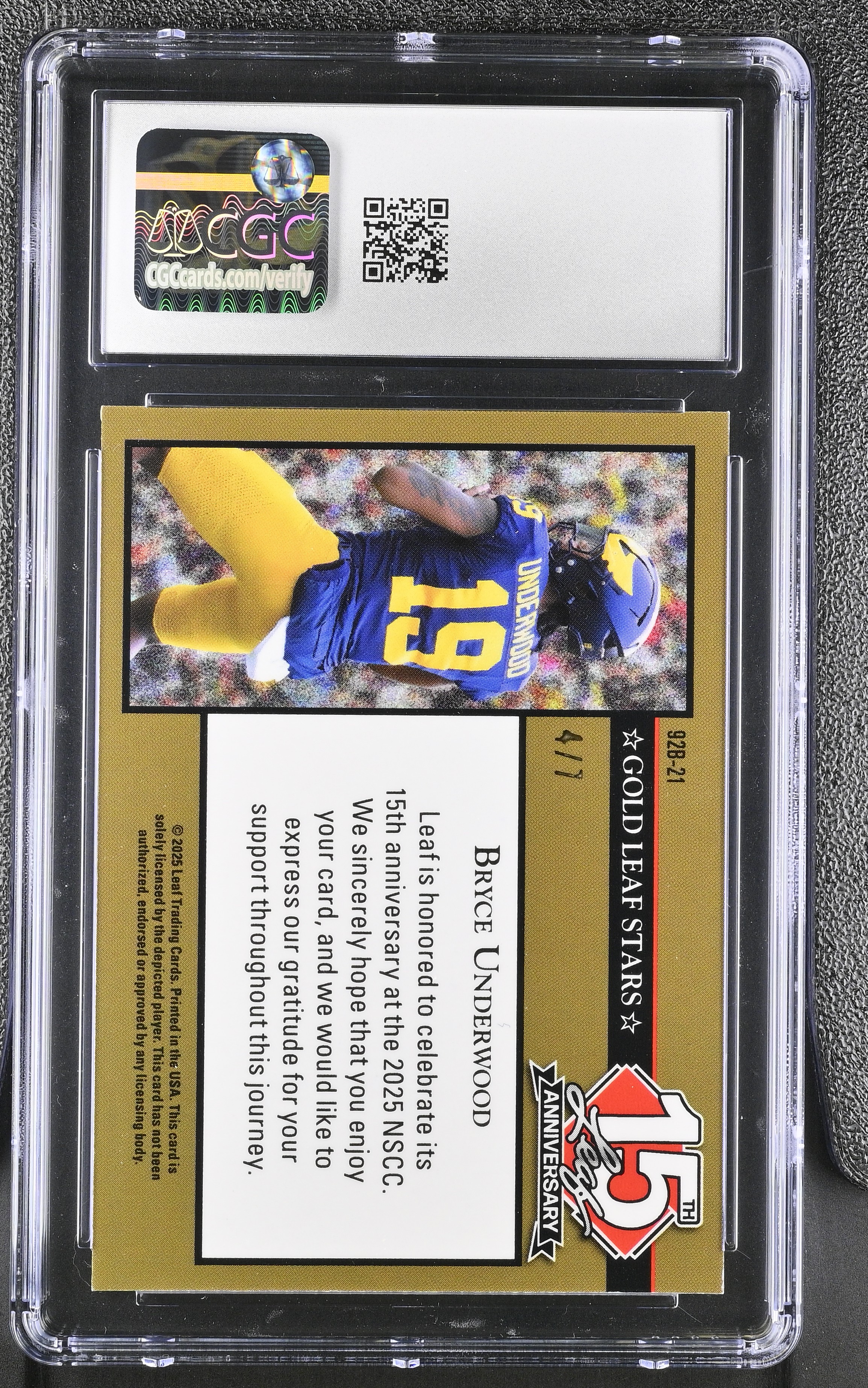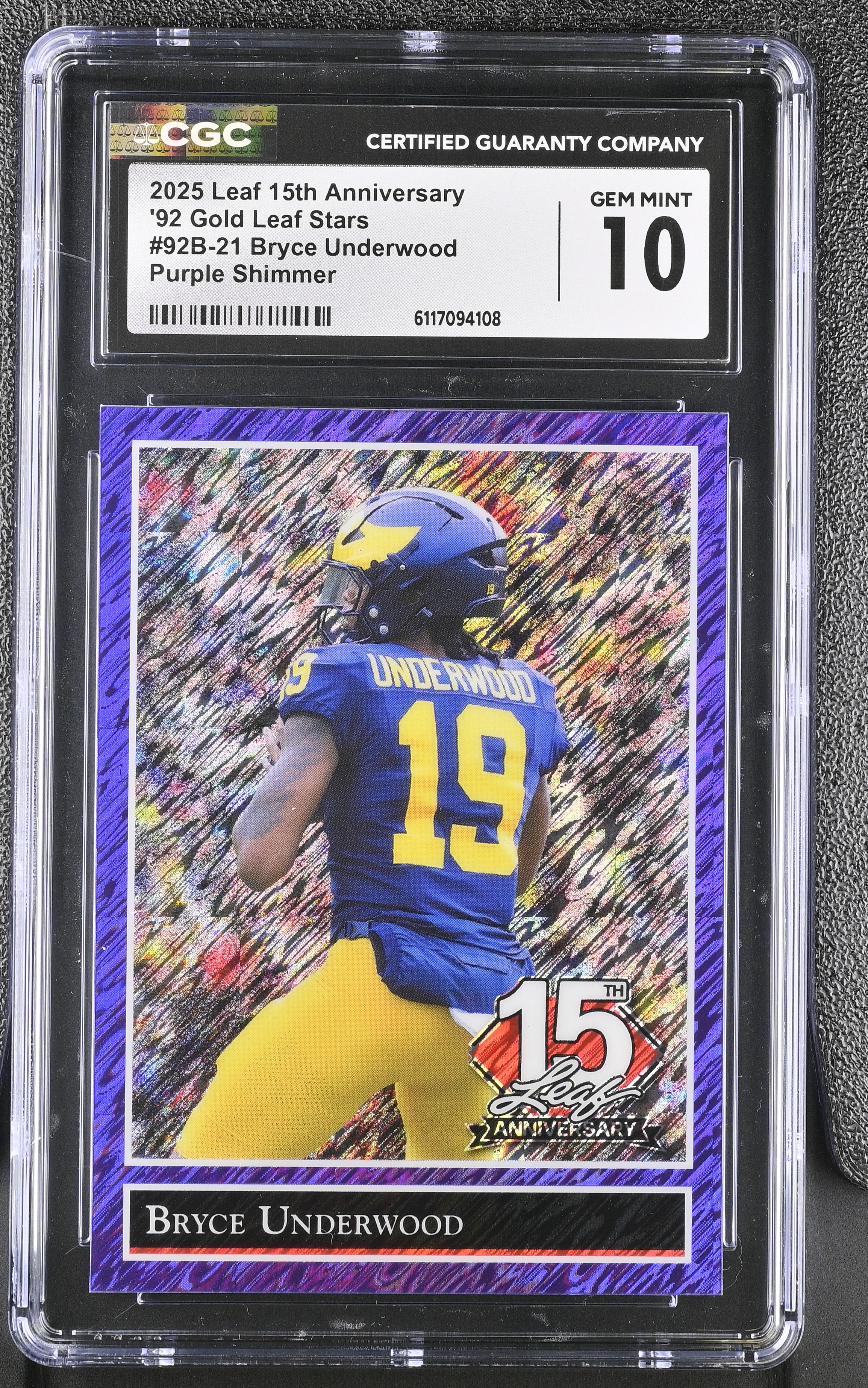 Bryce Underwood 2025 Leaf 15th Anniversary '92 Gold Leaf Stars Purple Shimmer #92B21 RC #4/7 (CGC 10)