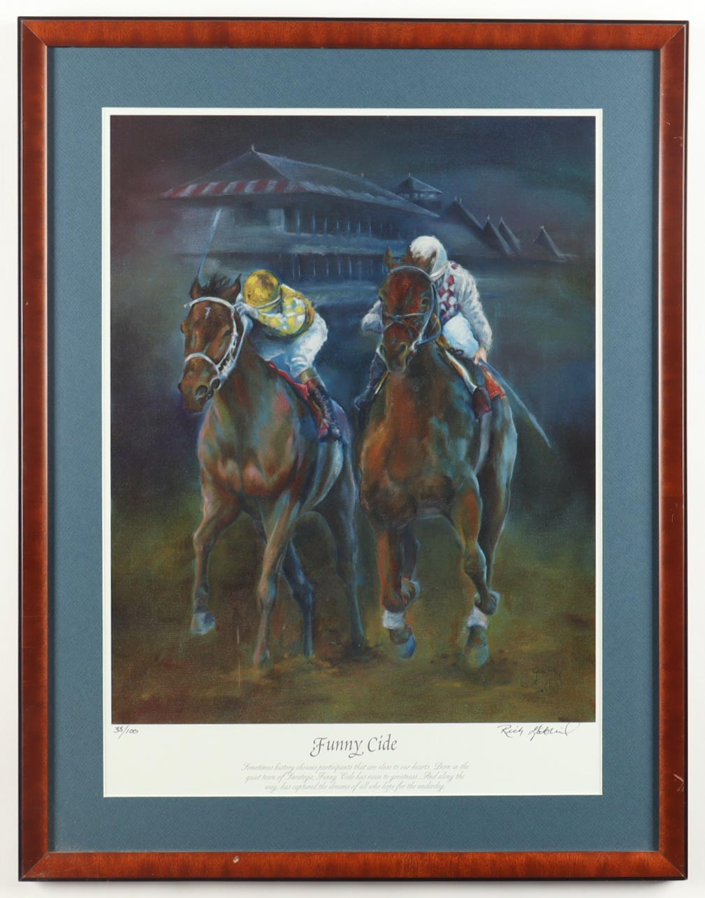 "Funny Cide" is a lithograph on archival paper, and signed with the artist's printed facsimile signature in the lower right. Measures approximately 22" x 28". Piece is limited edition #35/100. Please note the framing is scuffed.