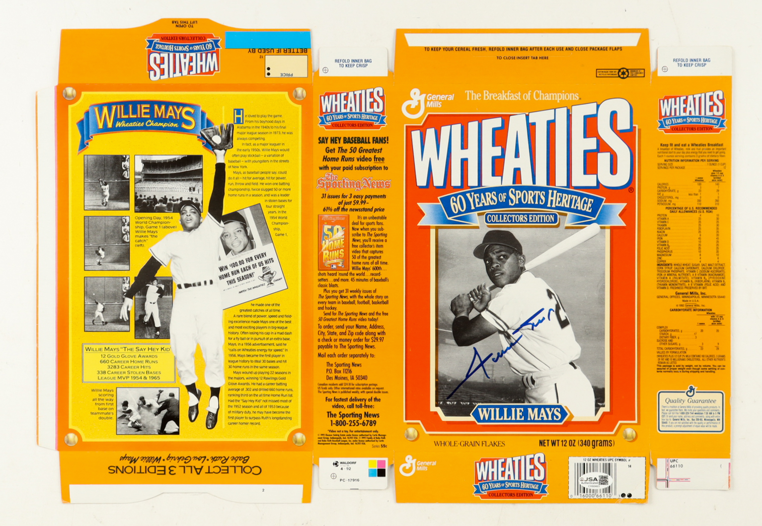 Wheaties Unused cereal box hand-signed by Willie Mays (D. 2024, San Fransisco Giants, HOF). Please note, the cereal box is uncut and unused. Refer to photo regarding the condition of the item.