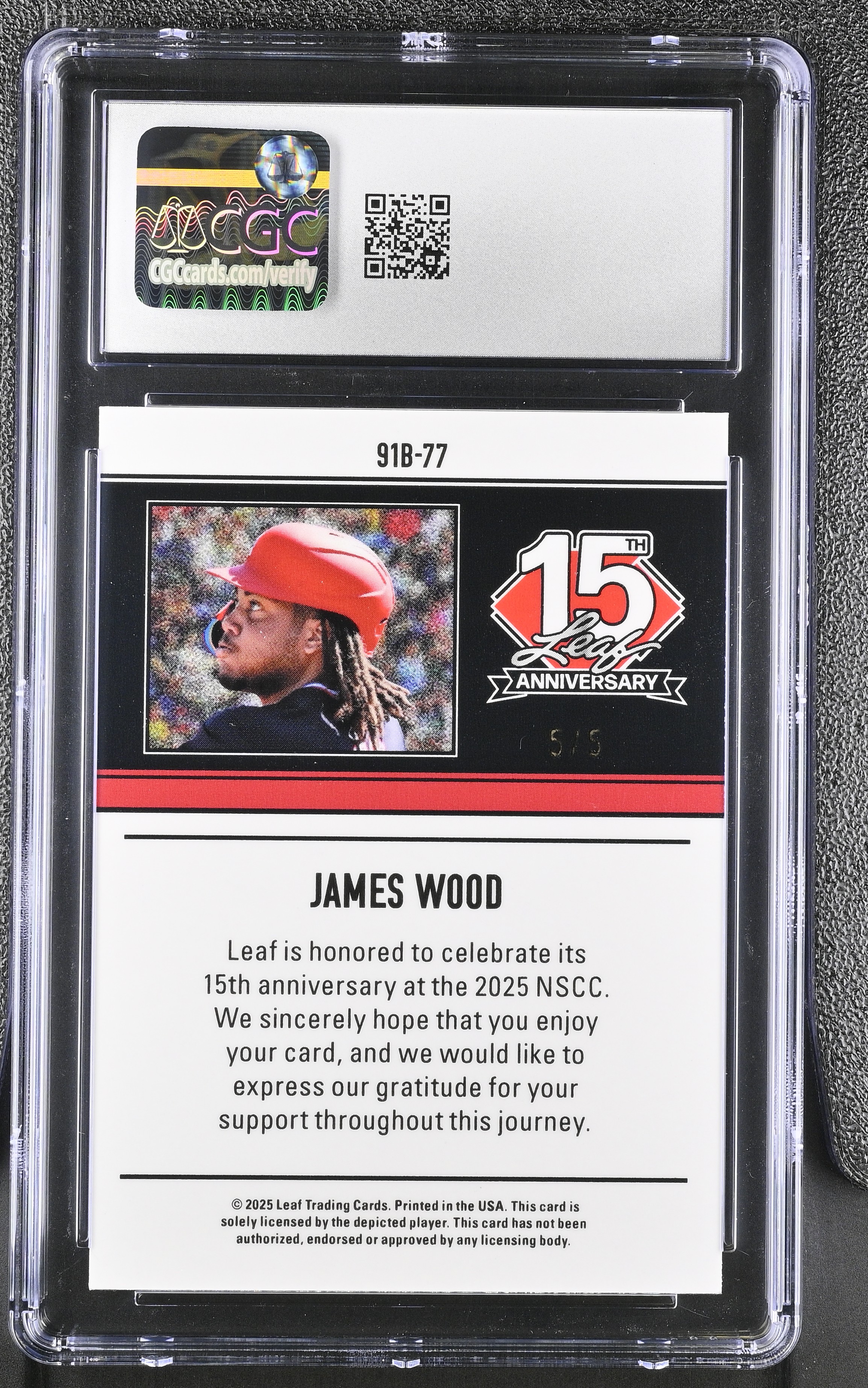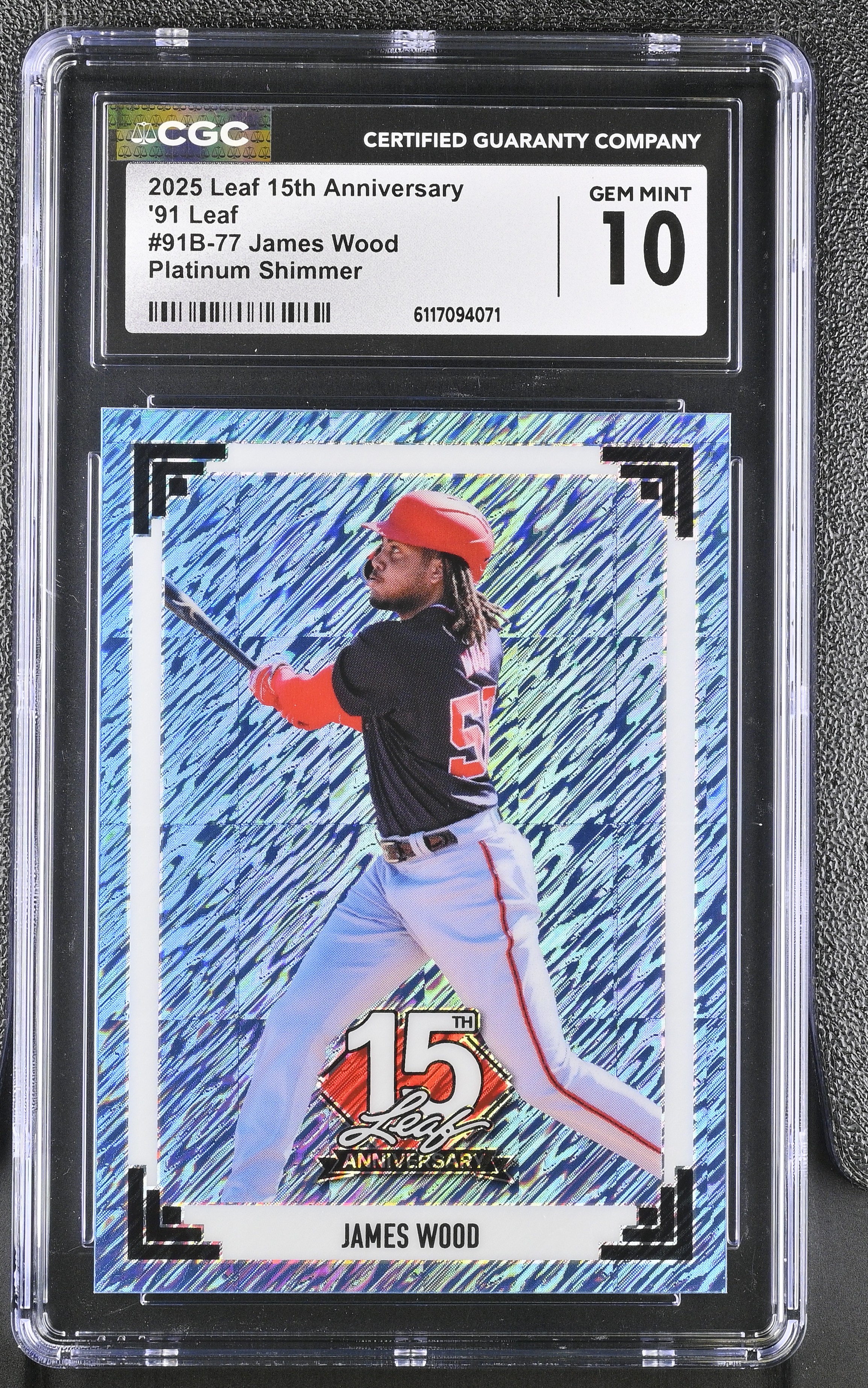 James Wood 2025 Leaf 15th Anniversary '91 Leaf Platinum Shimmer #91B77 RC #5/5 (CGC 10)