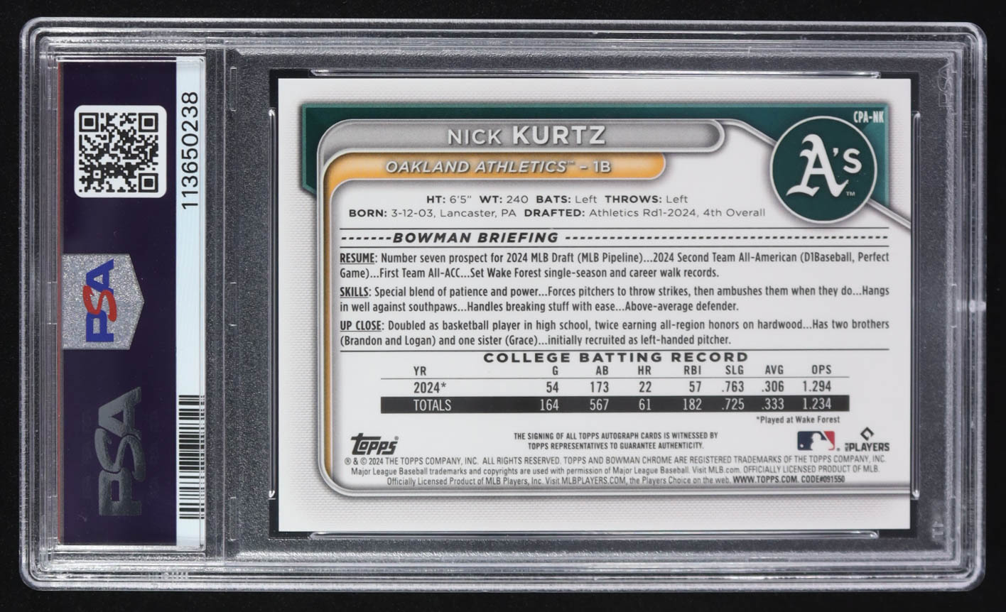 Nick Kurtz 2024 Bowman Chrome Draft Autographs #CPANK RC (PSA 9)