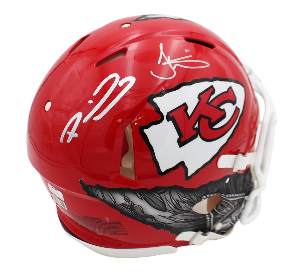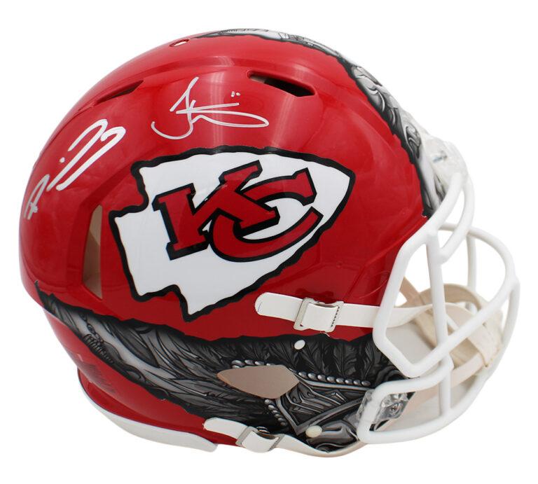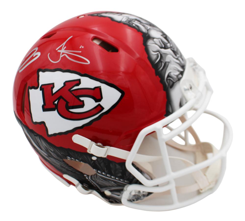 Riddell Kansas City Chiefs full-size authentic on-field ripped alternate speed helmet has been hand-signed by Patrick Mahomes and Tyreek Hill.