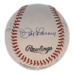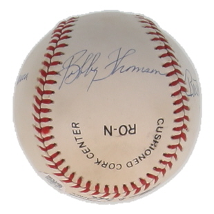 Rawlings Official National League baseball. Hand-signed by (4) with Bill Mazeroski, Bobby Thomson, Ralph Branca & Don Larsen. Please note, ball has been naturally stained and toned.