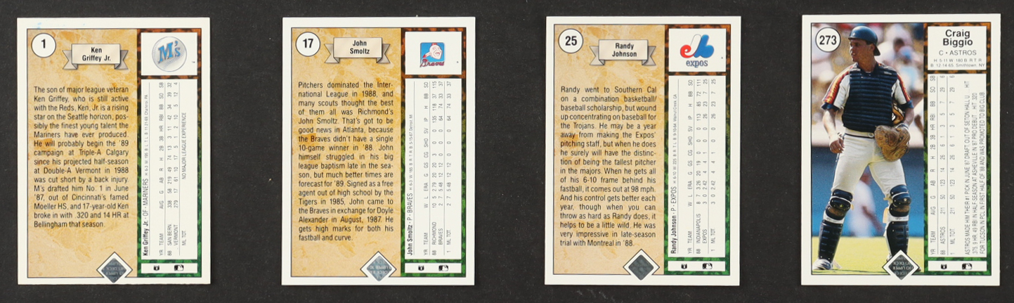 1989 Upper Deck Baseball Card Complete Set with (800) Cards with Randy Johnson #25 RC, John Smoltz #17 RC, Ken Griffey Jr . #1 RC, Craig Biggio #273