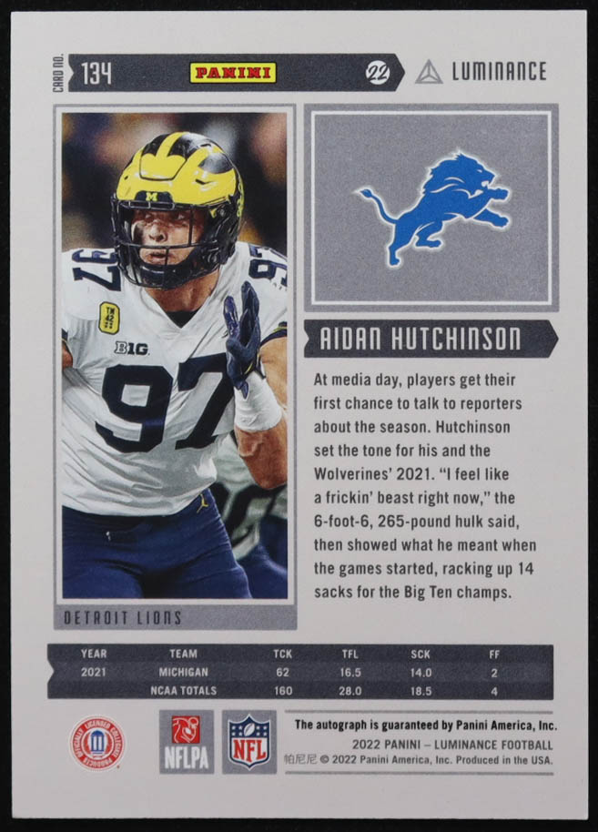 Aidan Hutchinson 2022 Panini Luminance Autographs #134 #004/249 RC