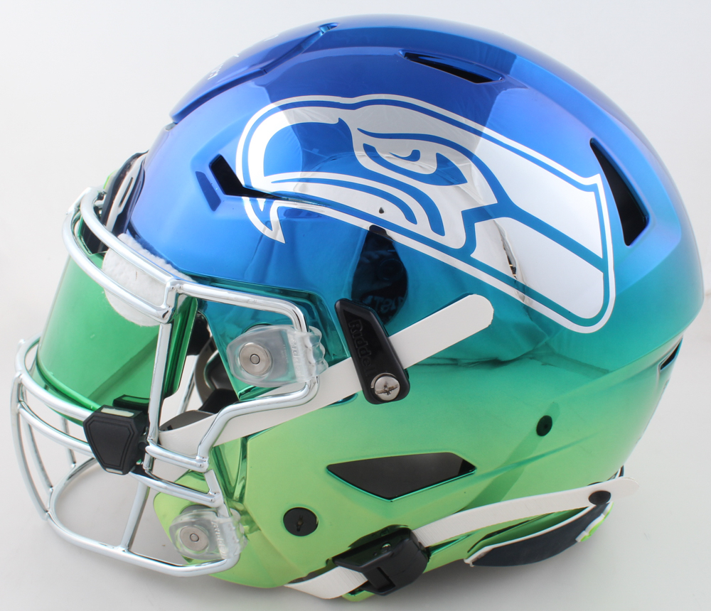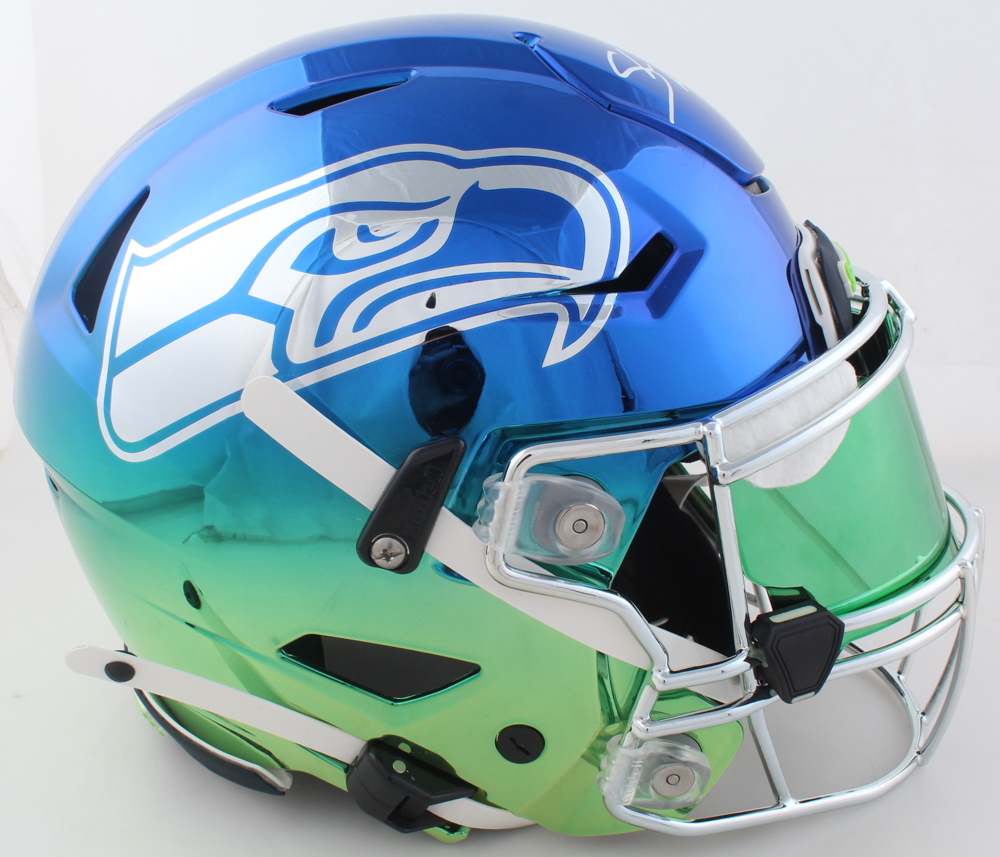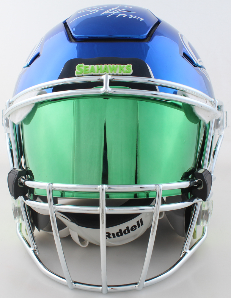 Riddell Seattle Seahawks full-size authentic on-field chrome speed flex helmet with a visor. Hand-signed and inscribed by Shaun Alexander.