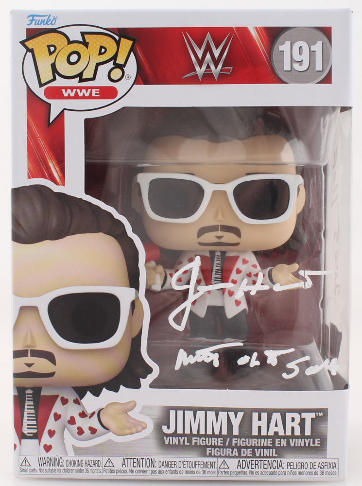 Vinyl figure measures approximately 4" tall. Hand-signed on the packaging by Jimmy Hart (HOF).