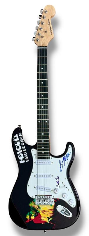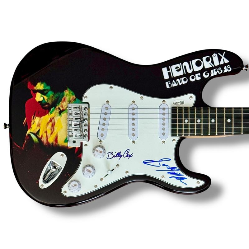 Custom Autograph Edition Stratocaster style electric guitar measures approximately 39" in length and has been hand-signed on the pickguard by Billy Cox (Bassist) and Buddy Miles (Drummer).