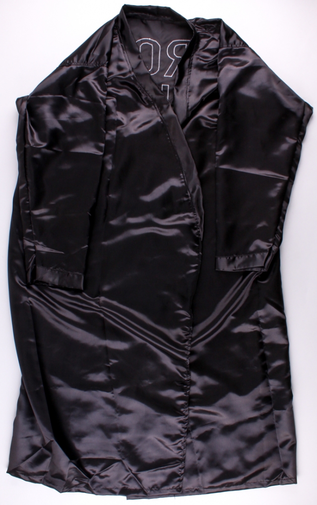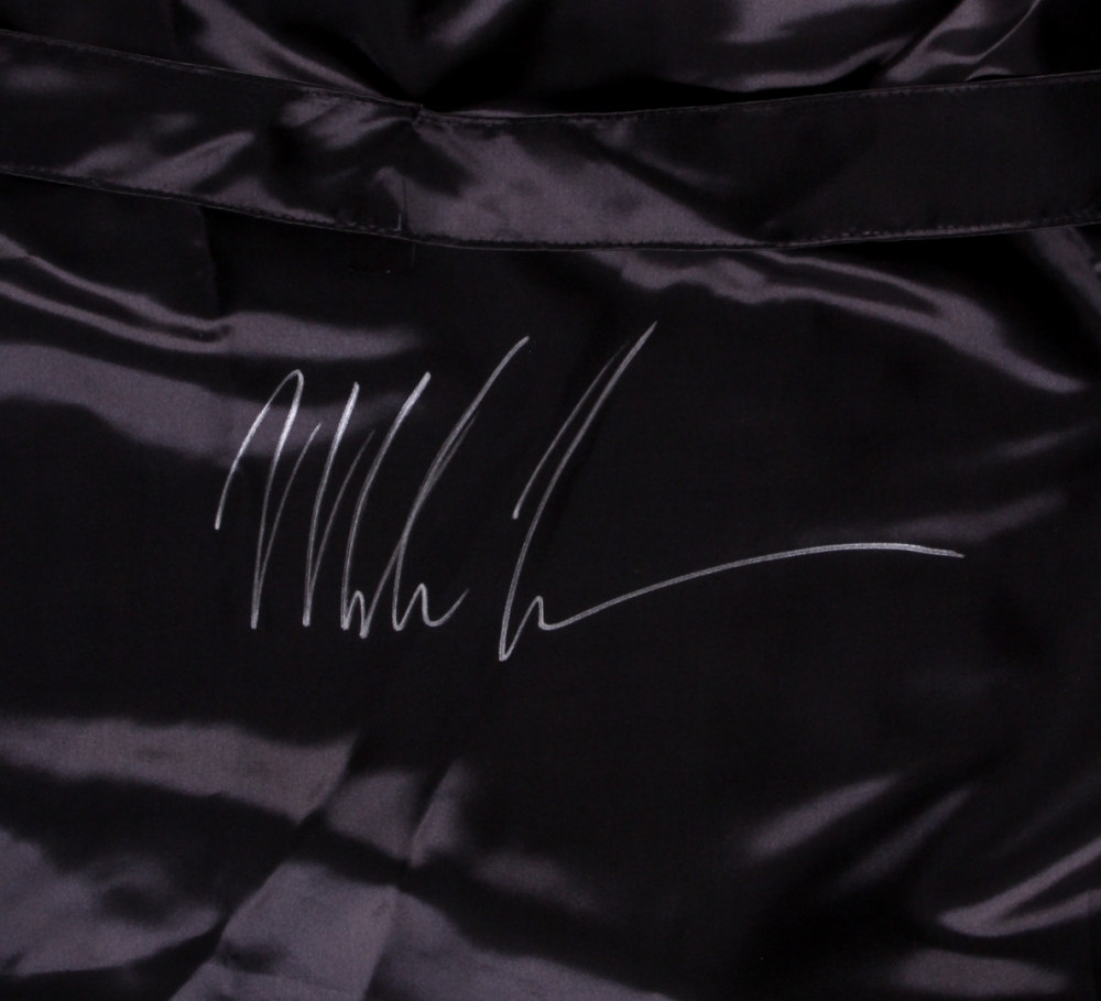 Custom full-size fight style boxing robe features "Iron Mike Tyson" stitched onto the back side of the robe. Hand-signed in silver paint-pen by Mike Tyson (HOF).