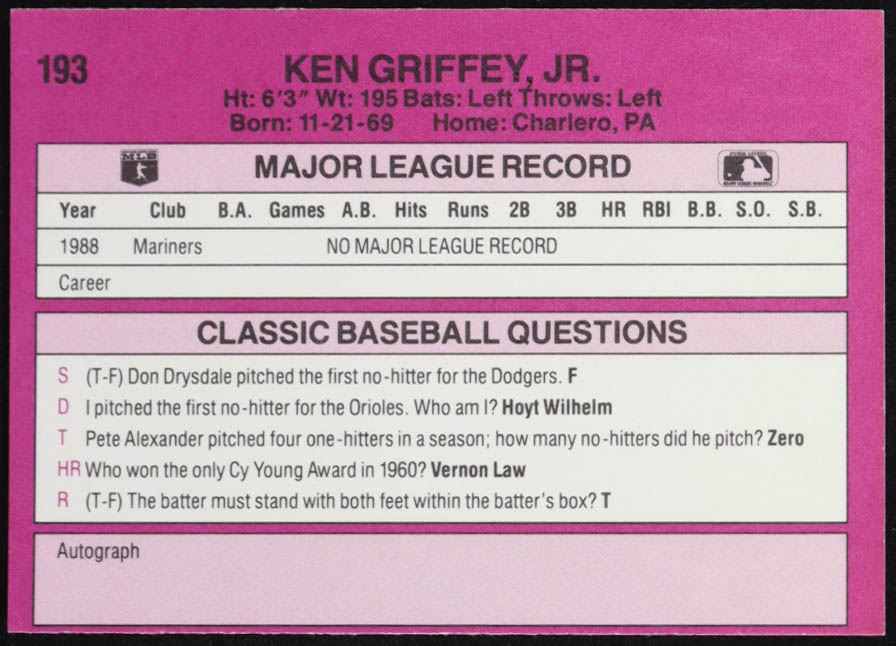 Ken Griffey Jr. 1989 Classic Travel Purple #193 RC