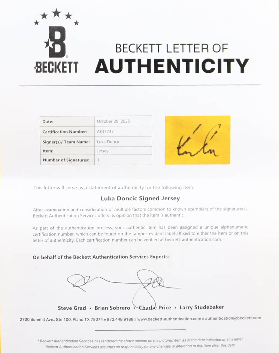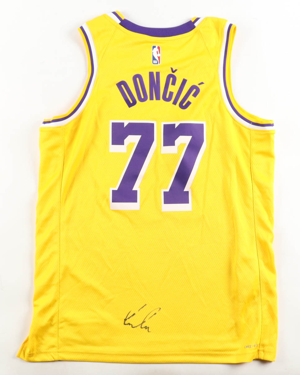 Nike authentic jersey with everything pressed on, size 48. Hand-signed by Luka Doncic (Los Angeles Lakers). Please note, there is staining on the front of the jersey. See photos regarding the condition of the item.