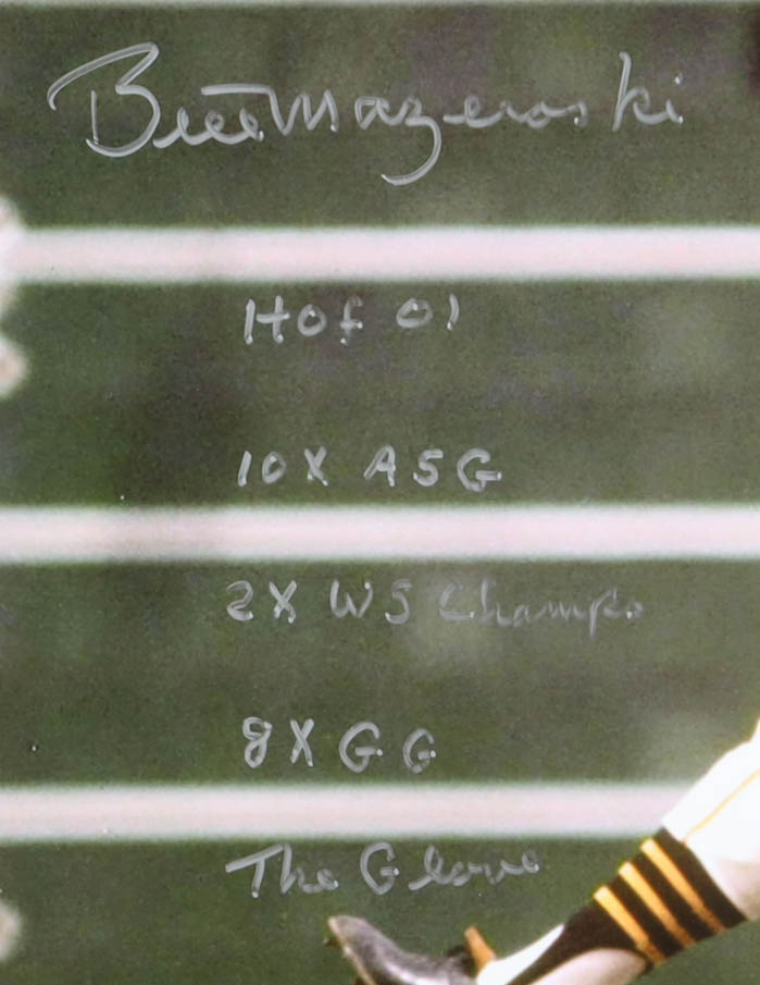 Photo measures 16" x 20" in size and has been hand-signed and inscribed by Bill Mazeroski (D. 2026, Pittsburgh Pirates, HOF).